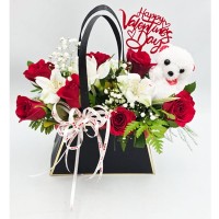 Composition: Red roses, alstroemeria or other seasonal white flowers, greenery, small filler flowers, handbag-style box, ribbon, teddy bear, and a Valentine’s Day topper. Variations may occur depending on availability.