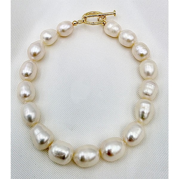 Experience the natural charm of this baroque pearl bracelet, where each freshwater pearl has a unique shape and luminous glow. Its gold toggle clasp adds both convenience and elegance. A versatile and timeless piece, it pairs effortlessly with casual outfits or more formal ensembles.