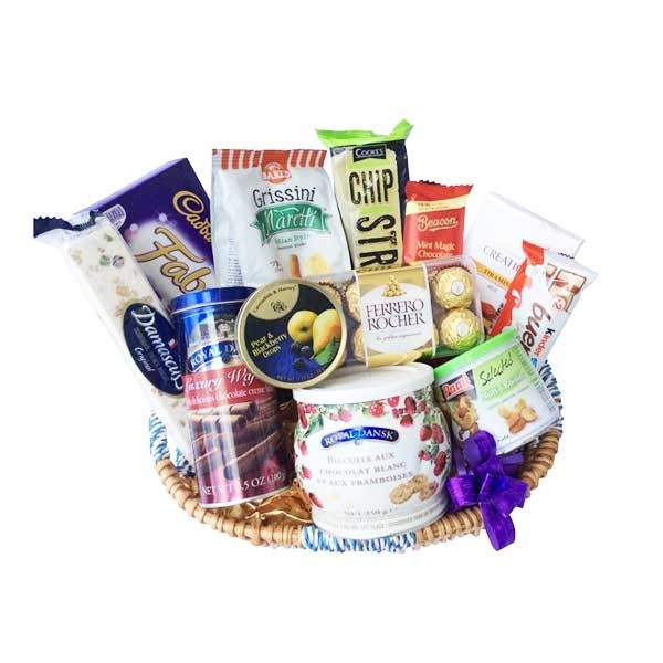 Composition : Chocolate Ferrero Rocher, biscuits Royal Dansk, sweets Cavendish & Harvey, nougat, snacks, chips, nuts and decoration. The products can be substituted with a product of same value