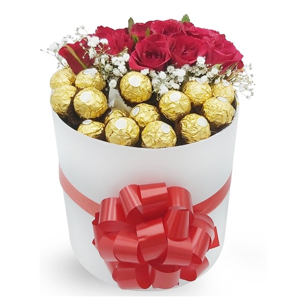 p>Composition :Environ 12-14 roses avec 16 chocolats Ferrero Rocher et 12 chocolats Rafaello