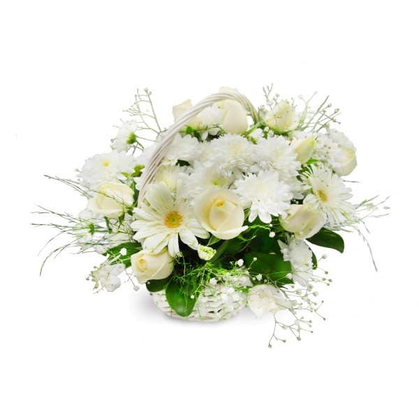 Composition: Panier en osier blanc, roses blanche, gerberas blanc, chrysanthème blanc. gysophile et feuillage. Les fleurs peuvent varier en fonction des disponibilités.